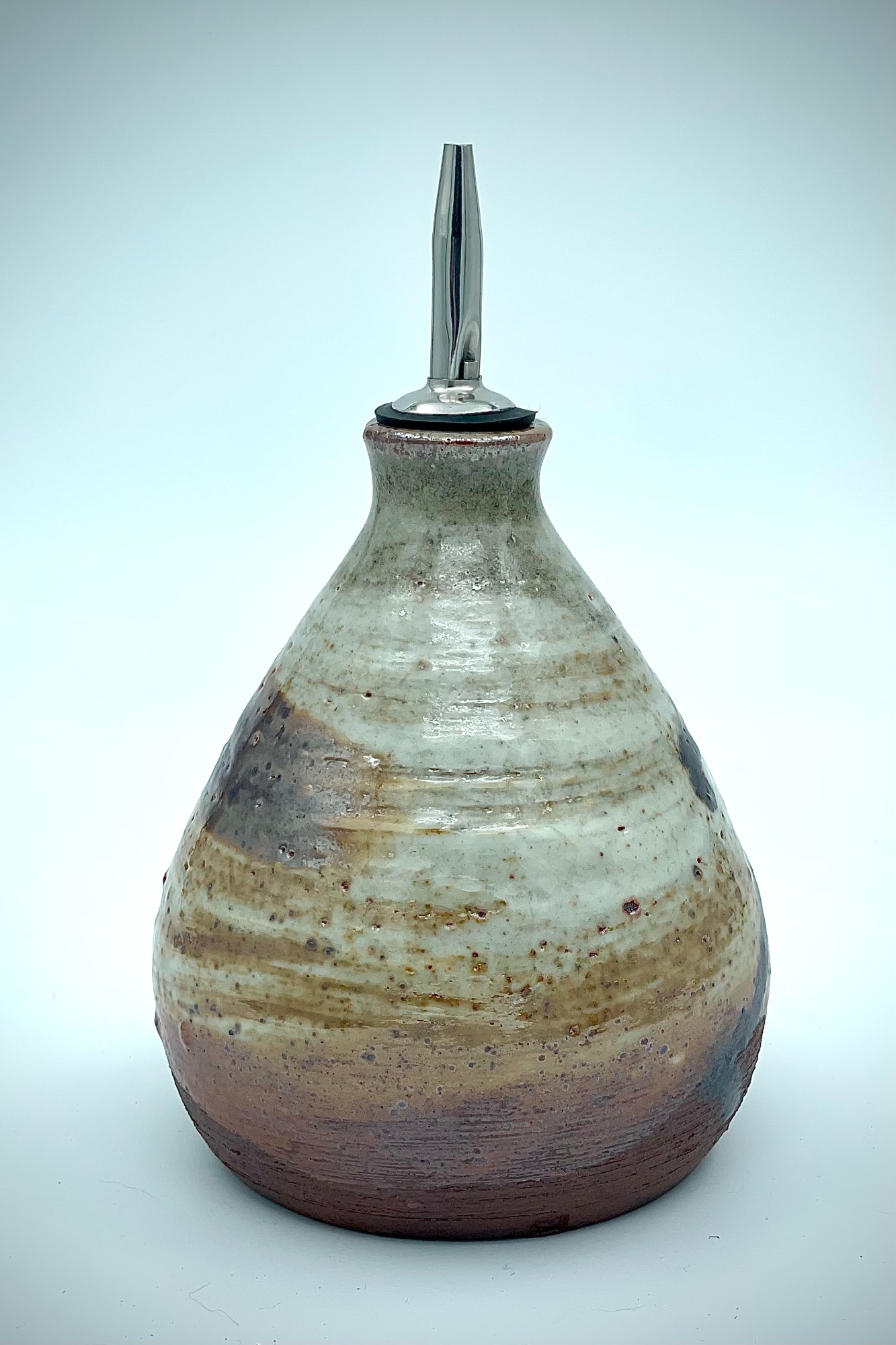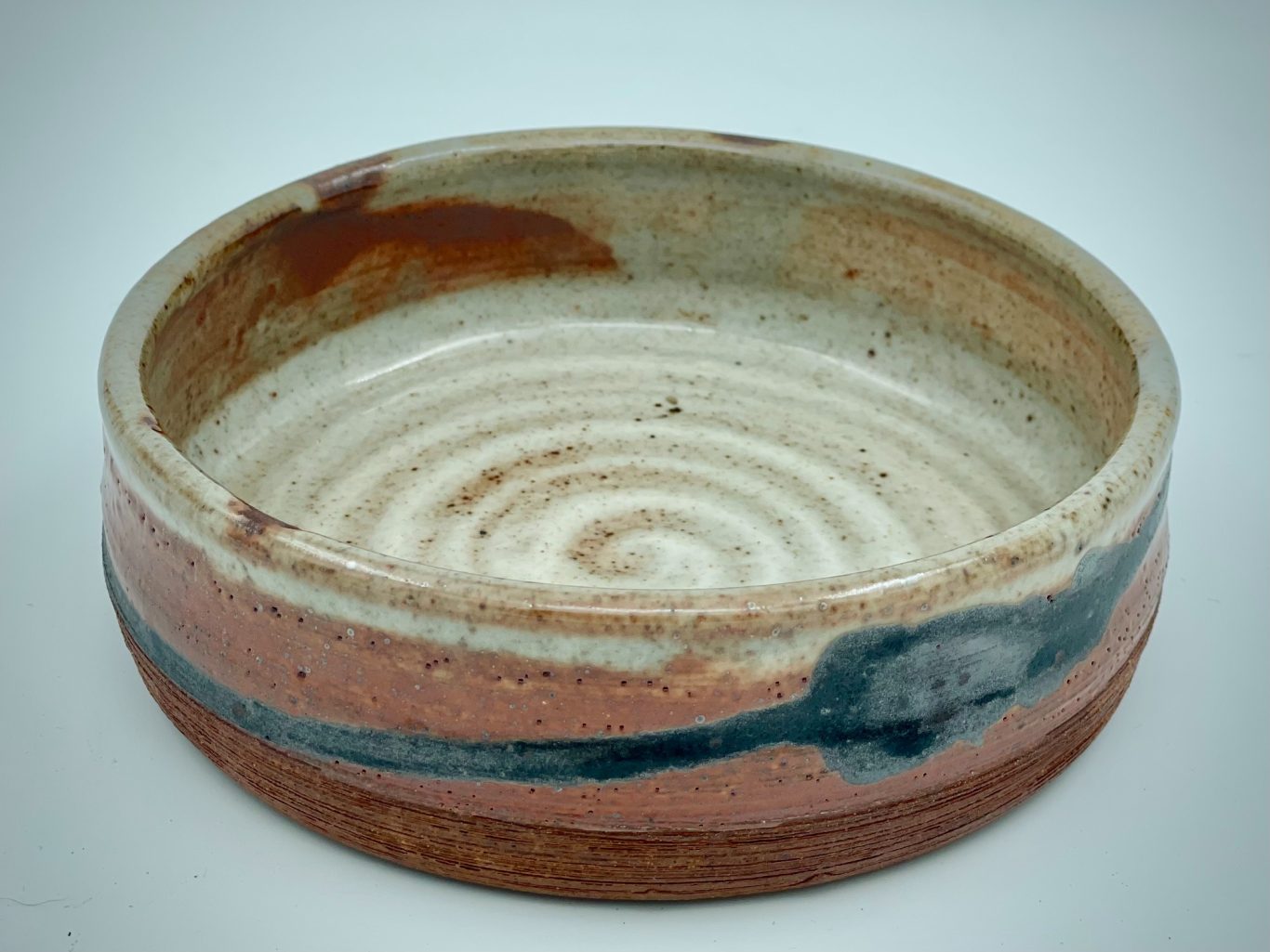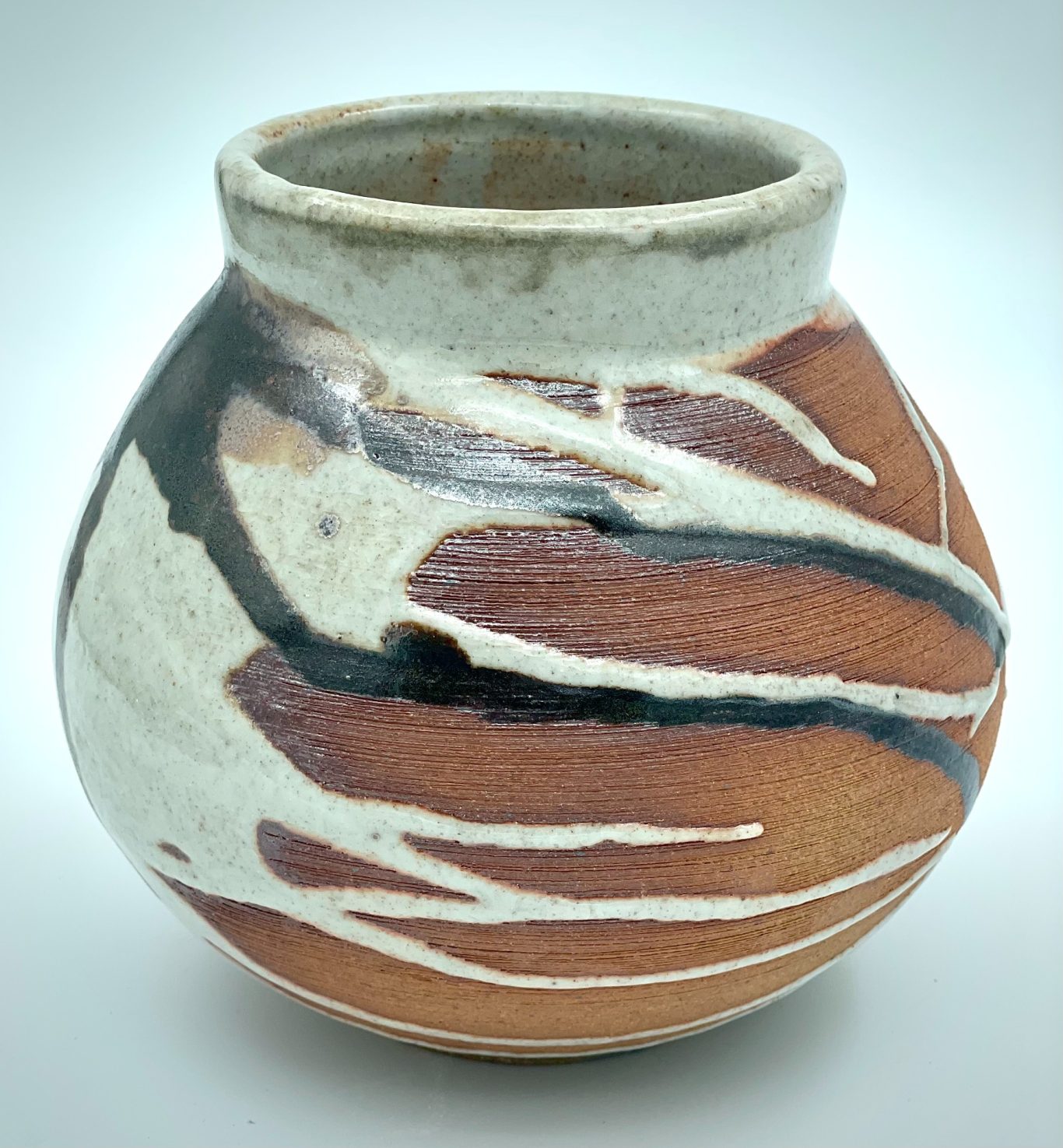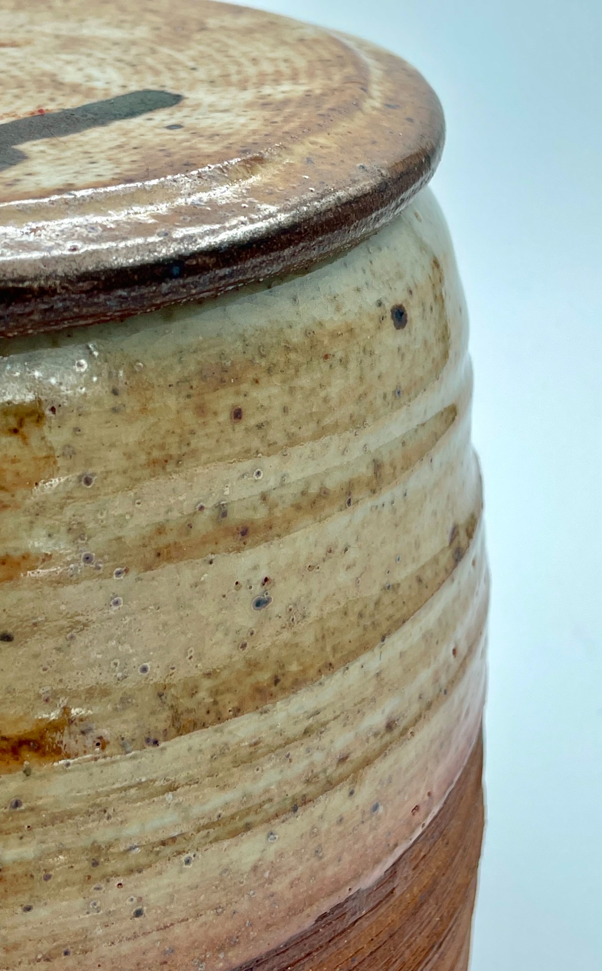 - Wood fired lidded jar. Shino glaze, local iron-rich decoration