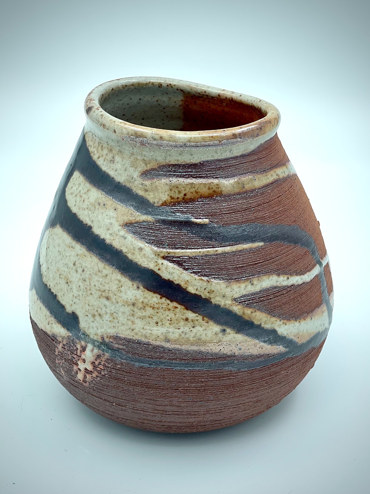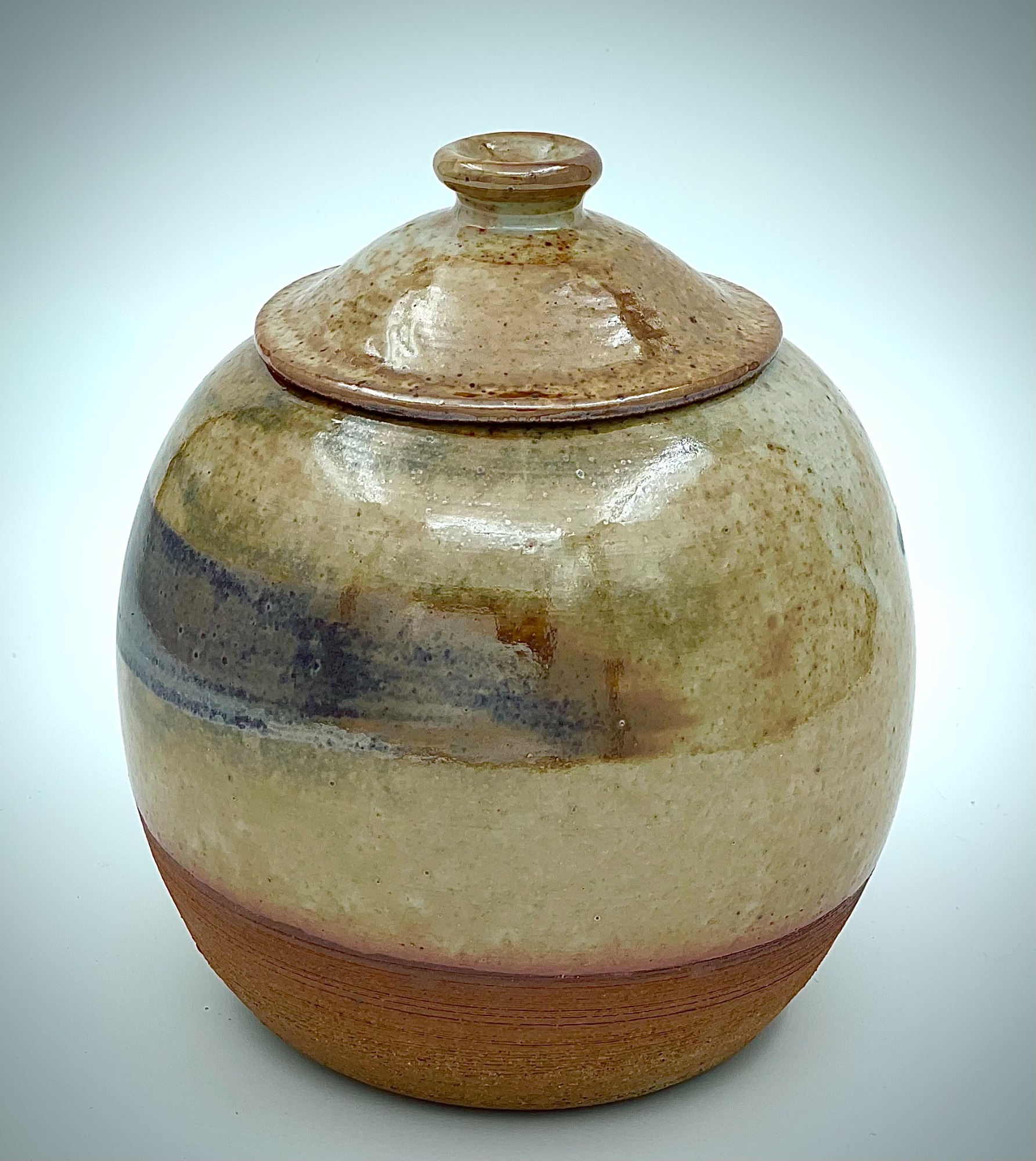 - Wood fired lidded jar. Shino glaze, local iron-rich decoration